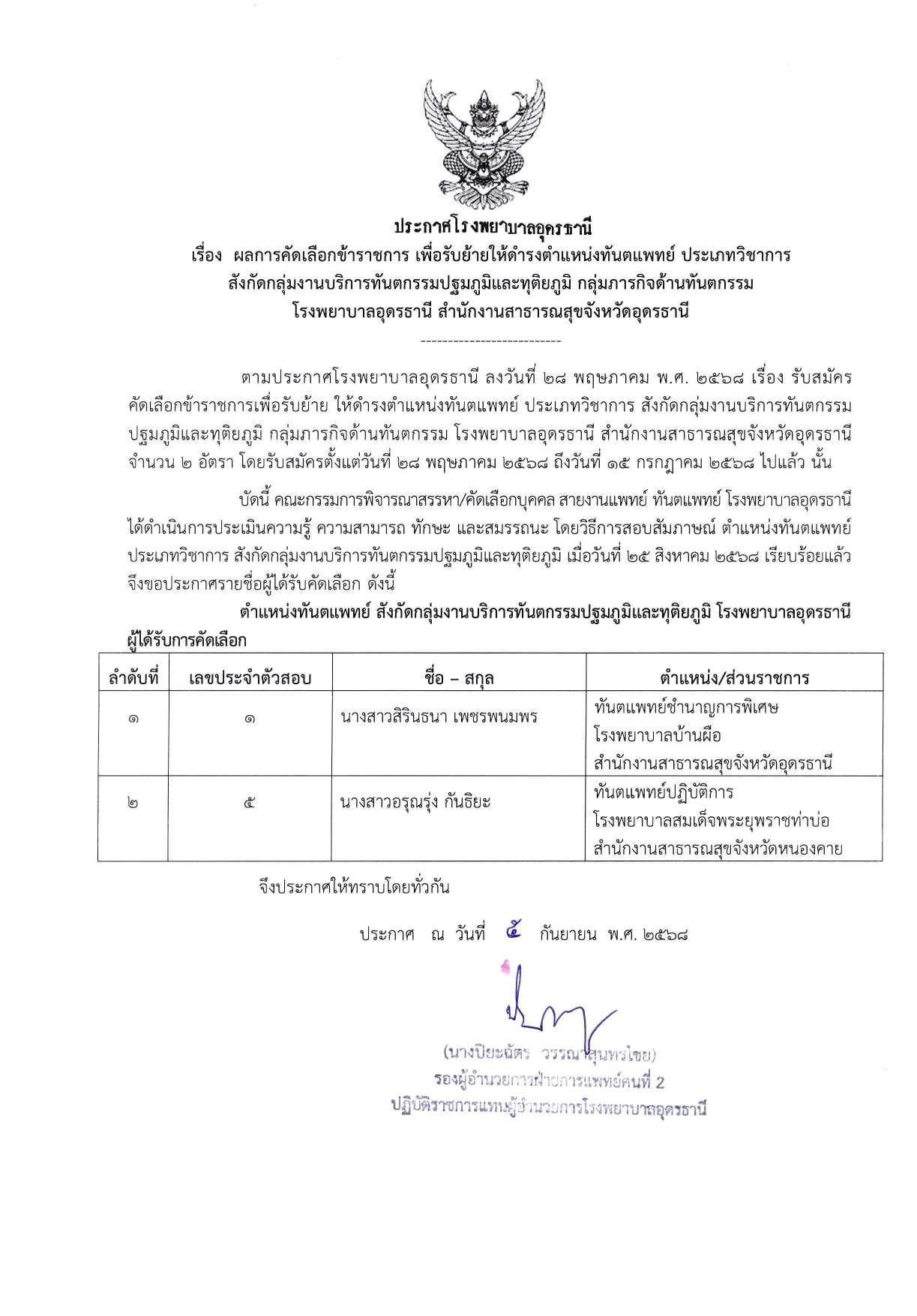 ประกาศ ผลการคัดเลือกข้าราชการ เพื่อรับย้ายให้ดำรงตำแหน่งทันตแพทย์ ประเภทวิชาการ สังกัดกลุ่มงานบริการทันตกรรมปฐมภูมิและทุติยภูมิ กลุ่มภารกิจด้านทันตกรรม โรงพยาบาลอุดรธานี สำนักงานสาธารณสุขจังหวัดอุดรธานี